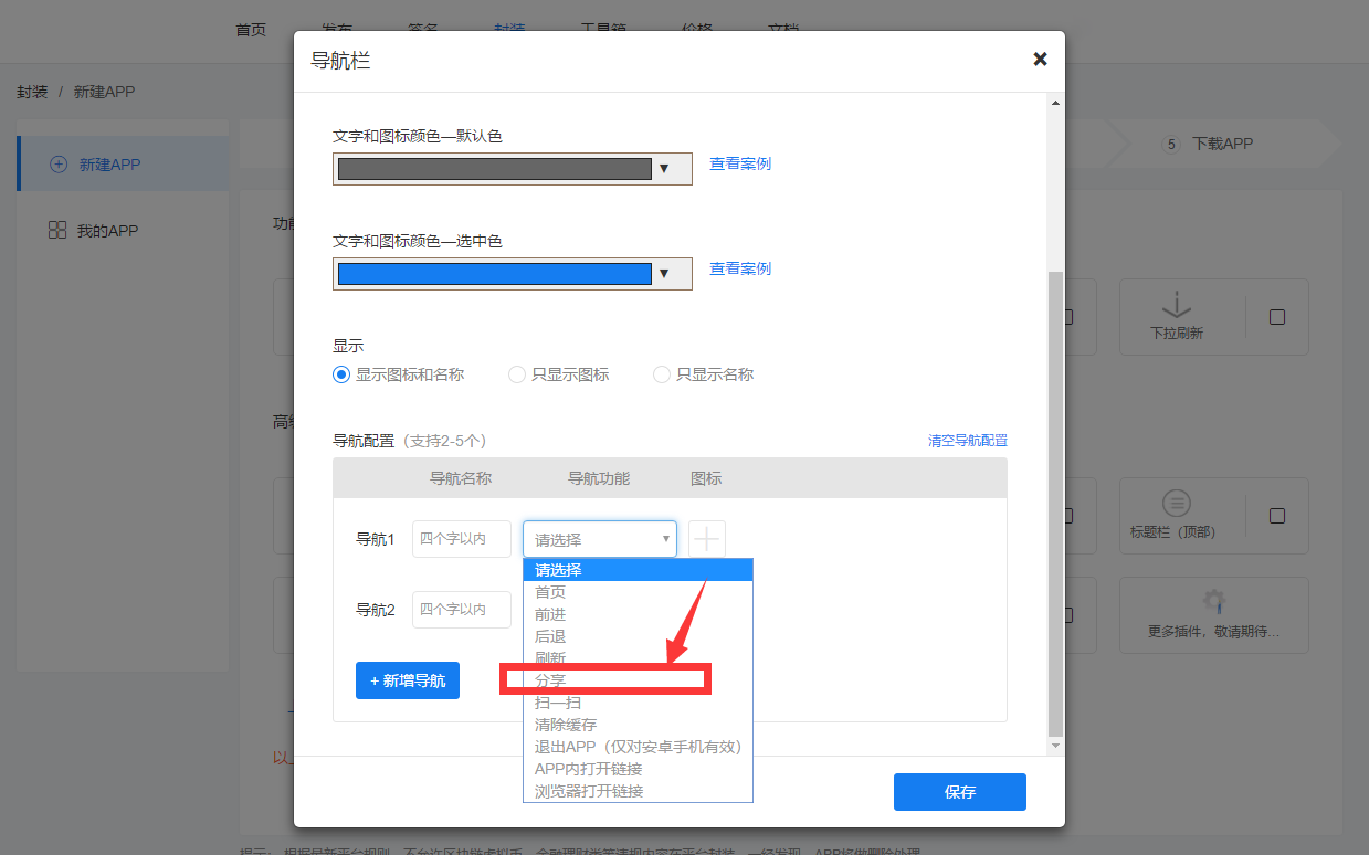 3. 去【顶部标题栏】进行选择分享按钮出现的位置。点击保存,重新封装APP即可。